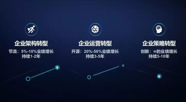 企业实现智慧转型与升级发展分三步走。首先是企业内部管理的组织架构转型,核心在于节流;第二步是通过运营实现企业对外的行业价值链的链接与重构,核心在于开源;最后是整合企业整个平台的系统与数据,进行更高维度的策略性分析与决策。通过由内而外、建立更高维度的策略分析,实现企业的智慧转型与升级发展。